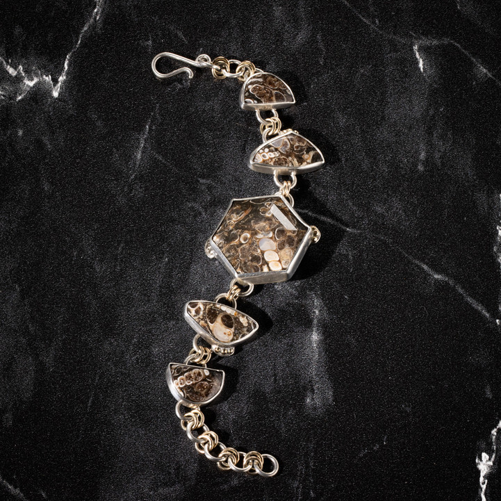 Materials: Sterling Silver, 10k Yellow Gold, and Turritella Agate